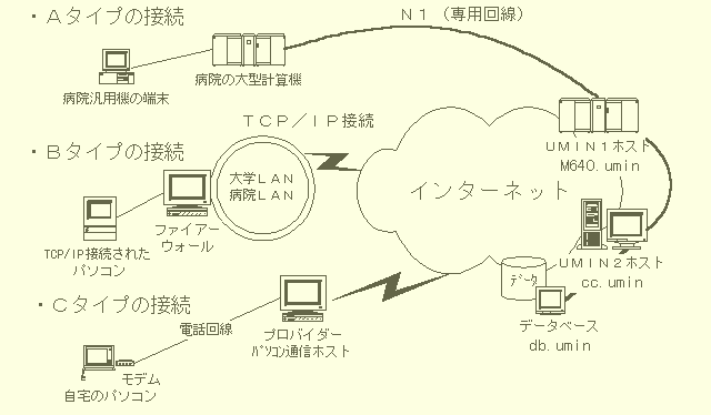 UMIN2に直接telnetで接続が可能な端末からは医薬品添付文書検索などUMIN2の検索システムを使っていただくことが可能です。インターネットに直結したパソコン端末からはマルチメディアの情報サービス(WWW)をご利用いただけます。